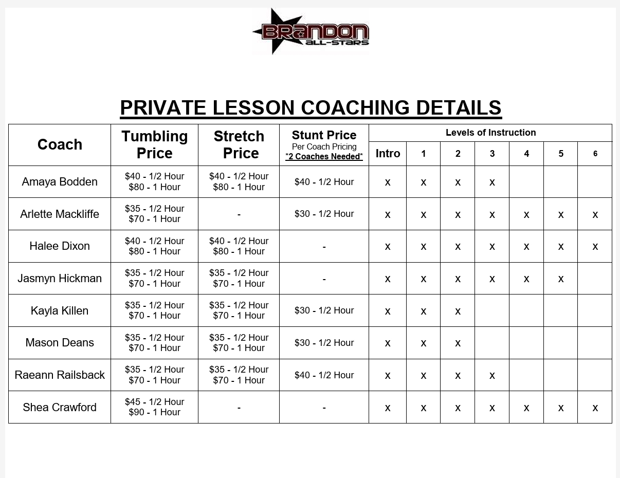 · RECURRING LESSON NOTE: To cancel a recurring lesson indefinitely, please send an email to Privatelessons@brandonallstars.com