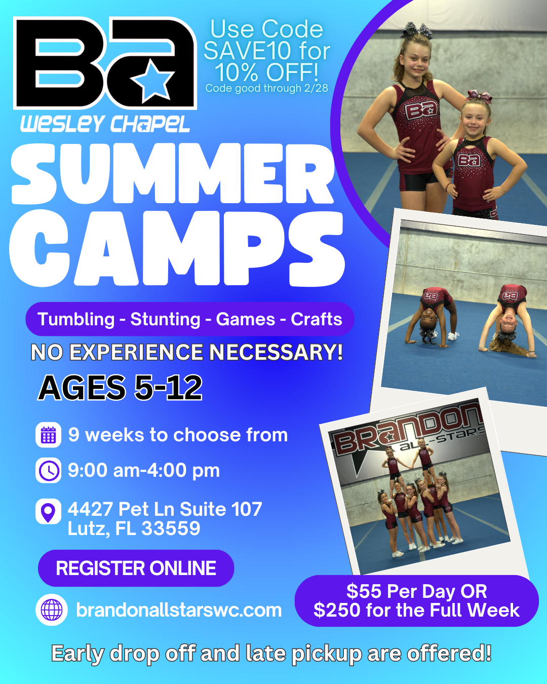 Summer Camp at BA is for cheer focused recreation. Campers will focus on basics of jumps, stunting, dance and tumbling while perfecting the skills they may already have.